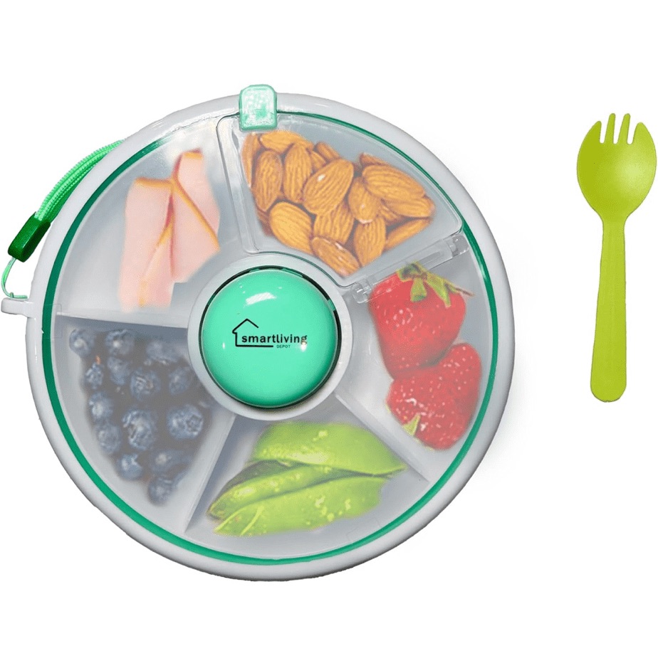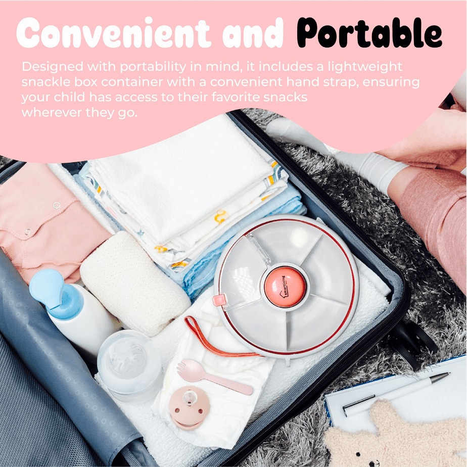 Snack Spinner box has five compartments. it’s really handy. The box is very toddler friendly many parents around us is loving this box because they don’t have to carry little boxes for every other food. They can just carry a container with five compartments and give it a go.